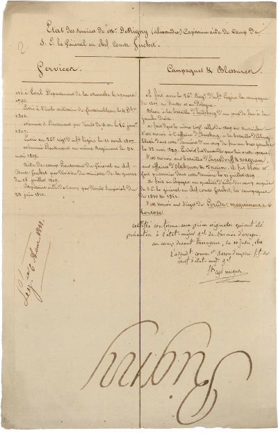 Immatriculé à Fontainebleau sous le n°1336, Alexandre de Rigny fait partie de la promotion 1807 de Saint-Cyr en sort sous-lieutenant au 26ème Léger le 16 janvier 1807. Le 10 juin, il fut blessé à l’attaque d’une redoute enlevée par son bataillon à des grenadiers russes ; il fit en 1807, 1808 et 1809, les campagnes de Prusse, d’Autriche et de Pologne. Il fut cité avec éloge au célèbre et meurtrier combat d’Ebersberg. À Essling, son régiment placé à l’avant-garde, lutta contre des masses autrichiennes ; blessé, il ne voulut pas quitter le champ de bataille ; le lendemain, il fut de nouveau blessé et mis hors de combat. Sa belle conduite lui valut le grade de lieutenant à l’âge de 19 ans. À Wagram, le jeune lieutenant commanda la compagnie en l’absence de son capitaine, qui venait d’être tué et se fit remarquer par son courage ; mais cinq jours après il fut atteint d’une balle à l’épaule et fut transporté à Vienne où le général Suchet commandant l’armée d’Aragon en fit son aide-de-camp.
