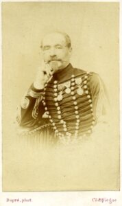 Le colonel Paul CARRELET, chef de corps 1868-1870 porte sur son dolman la légion d’honneur, la médaille de la campagne au Mexique et la croix d’officier de l’ordre de Notre Dame de Guadalupe (Mexique)