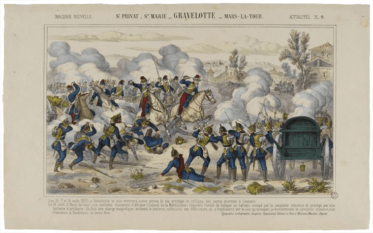 Le 2ème Hussards déplore 23 officiers tués ou blessés sur 32 et 83 hommes hors de combat à l’issue de ce combat de cavalerie qui a vu s’opposer 2900 cavaliers allemands à 2500 français sans véritable résultat. Après les combats de Saint Privat (18 août), enfermé avec l’armée de Metz, le 2ème contribua à plusieurs sorties, et se distingua notamment à Sainte-Barbe (30 août), Servigny-les-Sainte-Barbe (31 août) et Sainte Ruffine (28 septembre). Le 2ème Hussards qui a sacrifié ses chevaux pour atténuer la disette de la population messine, mérite le titre attribué par le général de Cissey de « 5ème régiment d’infanterie de sa division ». Le 27 octobre 1870, le Régiment fut compris dans la reddition de la place, mais de nombreux officiers s’évadèrent pour reprendre le combat.